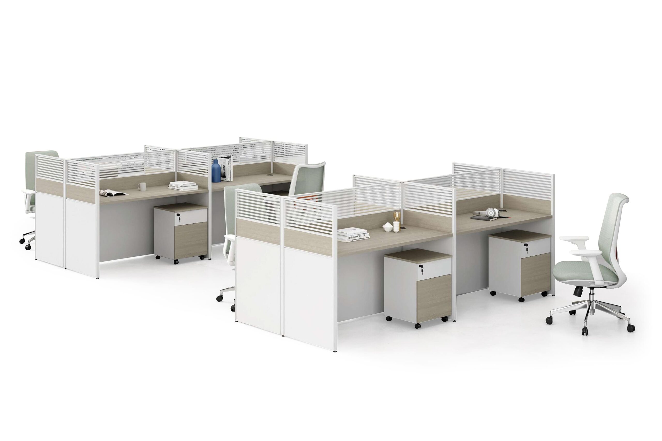 كل محطة عمل تُصنع بالكامل حسب الطلب، ويمكن تصميمها لشخص واحد أو لشخصين أو لعدد أكبر، وفقاً لمساحة عملك واحتياجاتك.