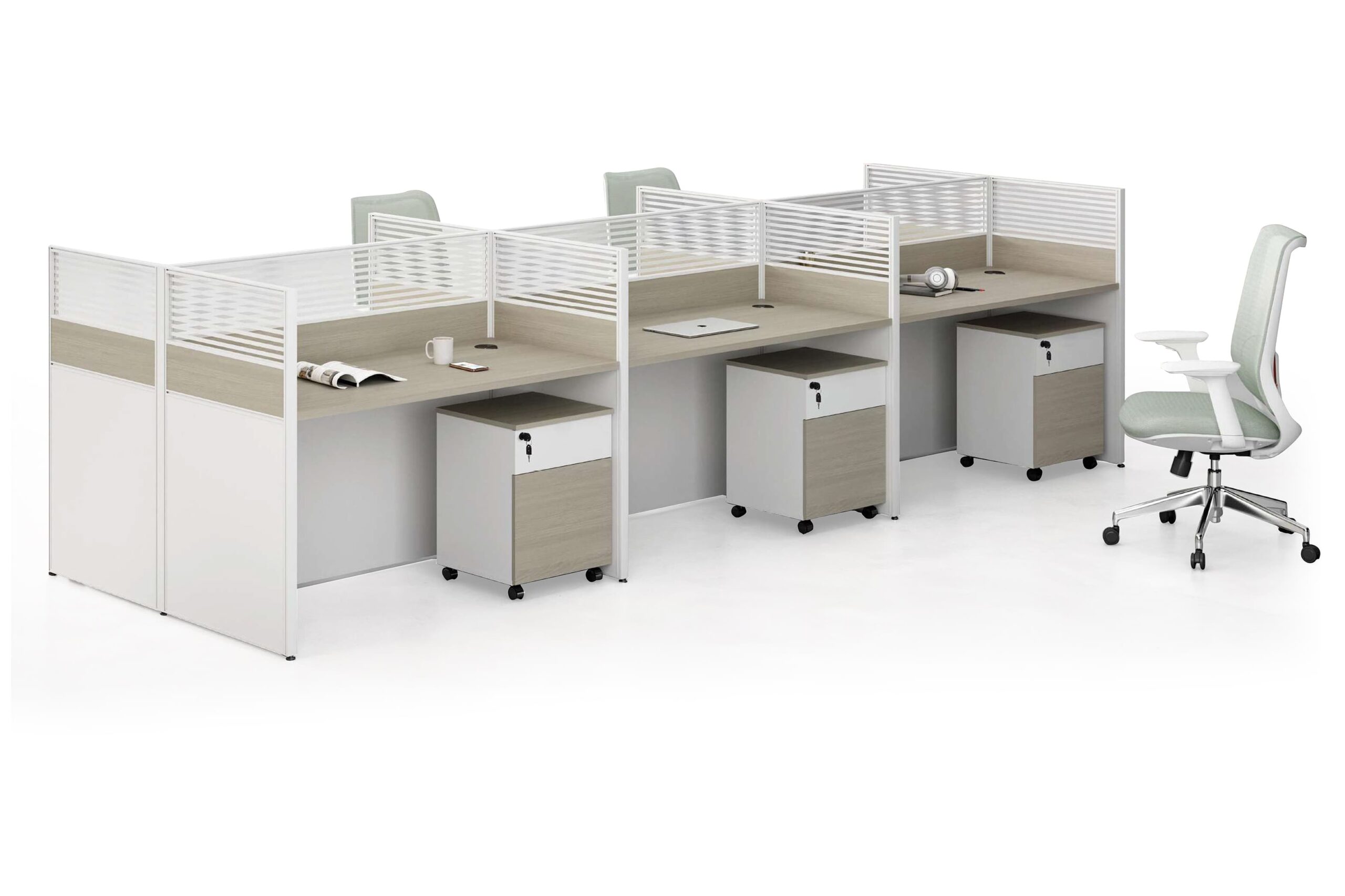 يتم تصنيع كل محطة عمل في مصنع رويا للأثاث المكتبي باستخدام خشب الـ Chipboard عالي الجودة والمغلف بمادة الميلامين المقاومة للخدش والرطوبة، مع حواف PVC أنيقة لضمان المتانة والمظهر الراقي.
